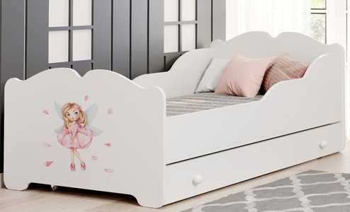 Kinderbett für Mädchen Anna 160 x 80 cm, weiß, mit Schublade, Lattenrost und Matratze + Motiv "Mädchen mit Flügeln"